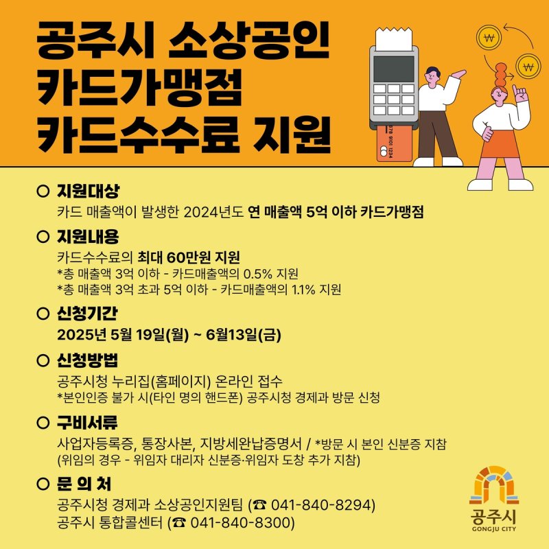 (공주=연합뉴스) 박주영 기자 = 충남 공주시는 경기 침체 장기화로 어려움을 겪는 소상공인을 위해 19일부터 소상공인 카드가맹점 카드수수료 지원사업을 확대 시행한다고 16일 밝혔다.