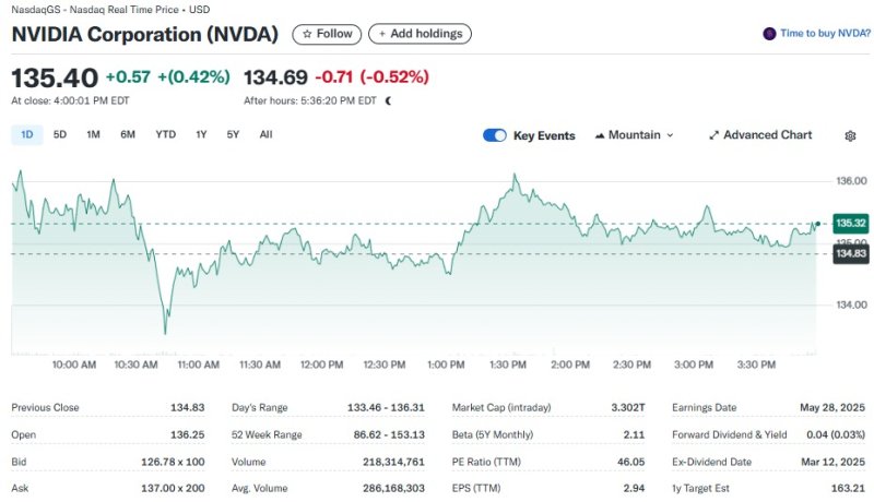 16일(현지시간) 뉴욕증시에서 엔비디아는 0.42% 상승한 135.40달러를 기록했다.
