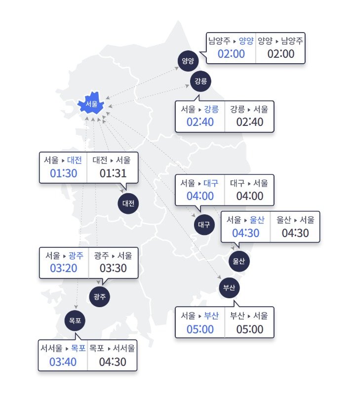 같은 시각 지방 도시에서 서울까지는 △부산 5시간 △울산 4시간 30분 △강릉 2시간 40분 △양양 2시간(남양주 도착) △대전 1시간 31분 △광주 3시간 30분 △목포 4시간 30분(서서울 도착) △대구 4시간이다.
