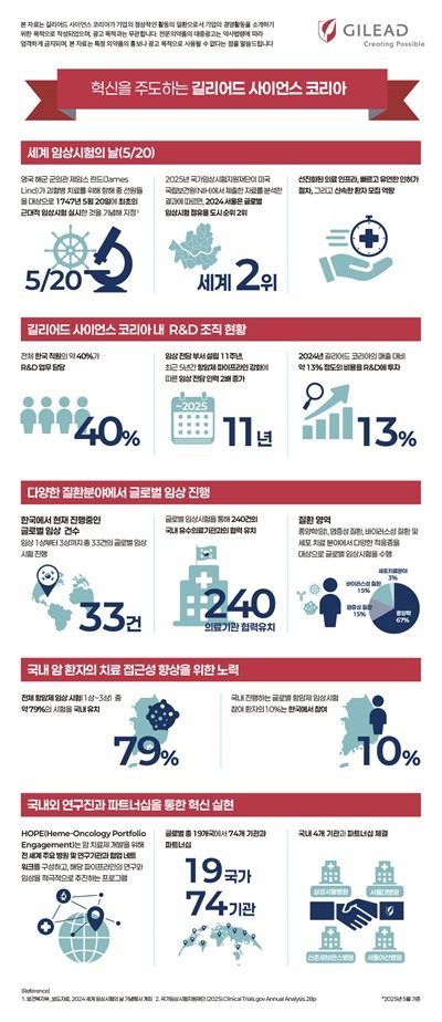 18일 길리어드 사이언스 코리아에 따르면 이 회사는 세계 임상시험의 날(5월 20일)을 맞아, 국내외 연구개발(R&D) 활동 성과를 조명하는 인포그래픽을 공개했다.