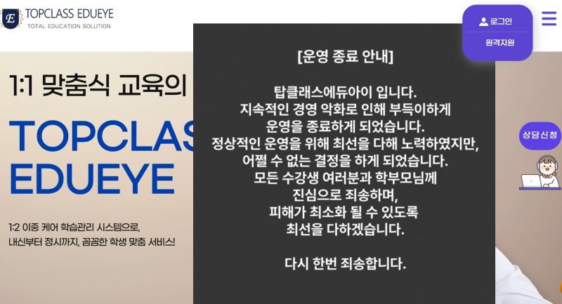 18일 업계에 따르면 탑클래스 에듀아이는 최근 공지문을 올리고 "지속적인 경영 악화로 인해 부득이하게 운영을 종료하게 됐다"고 밝혔다.