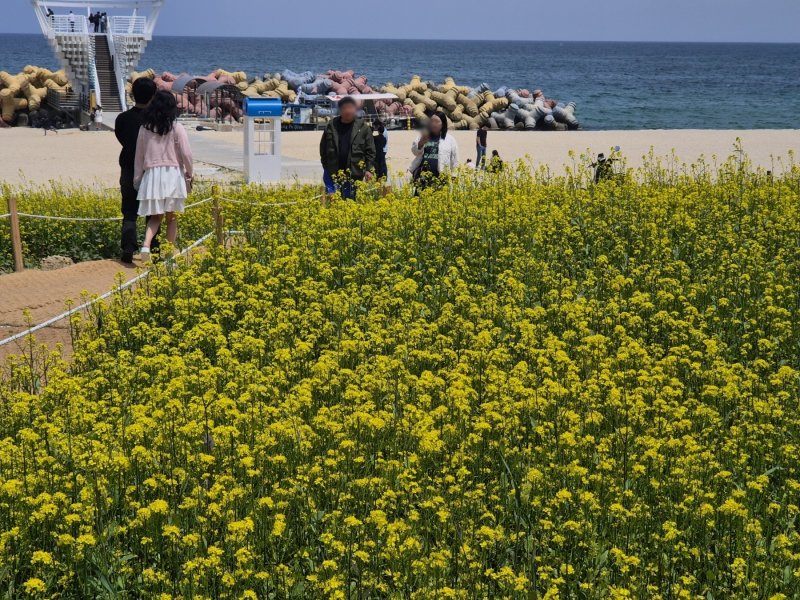 이날 사근진 해변은 노랗게 물든 유채꽃밭에서 인생샷을 찍으려는 연인과 가족 나들이객으로 가득했다.