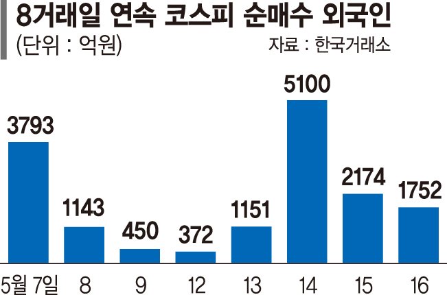 대신증권 이경민 연구원은 "코스피는 최근 외국인 투자자의 순매수 확대가 지속되면서 강보합을 유지하고 있다"라며 "5월 초 연휴 이후 외국인은 꾸준히 코스피를 매수 중인데 이는 상승반전의 긍정적 신호"라고 판단했다.
