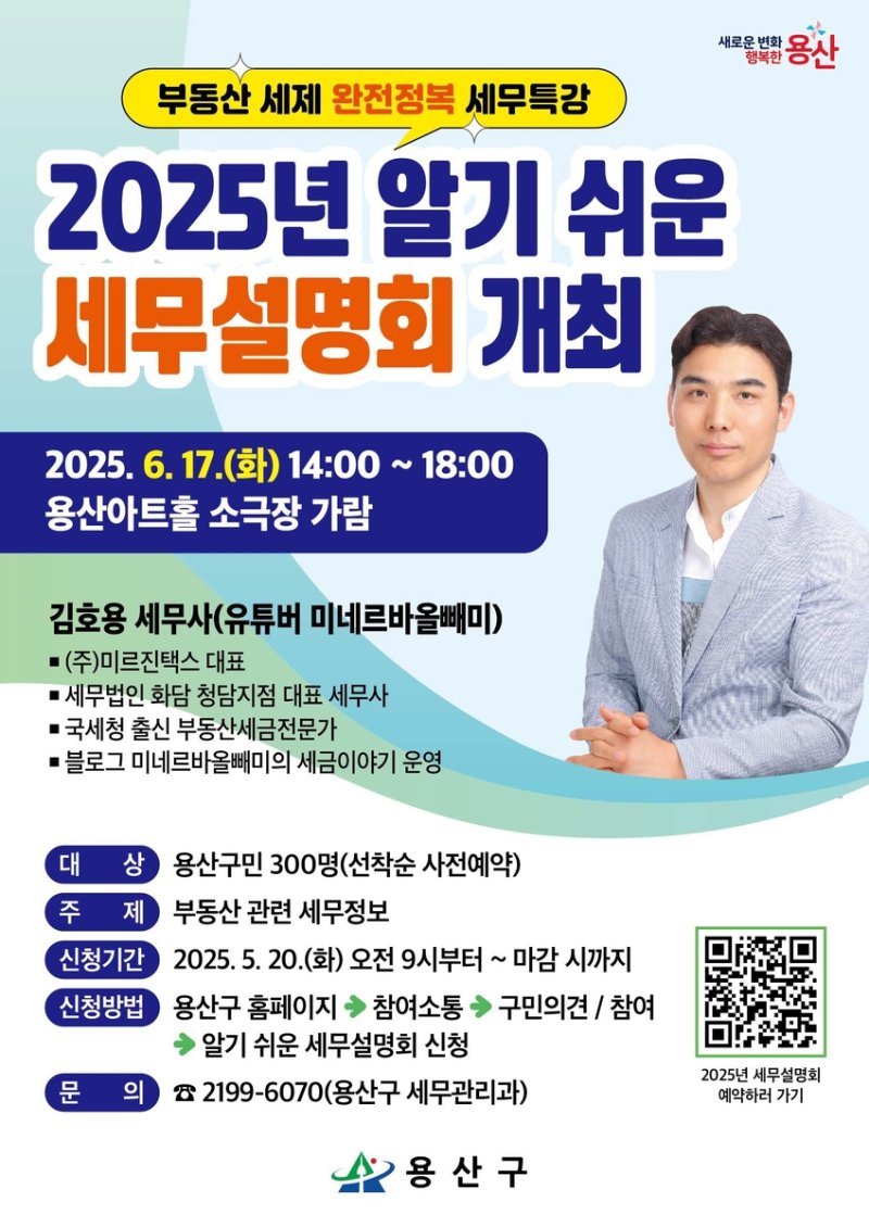 (서울=연합뉴스) 정준영 기자 = 서울 용산구(구청장 박희영)는 다음 달 17일 오후 2시 용산아트홀에서 '2025년 알기 쉬운 세무설명회'를 연다고 19일 밝혔다.