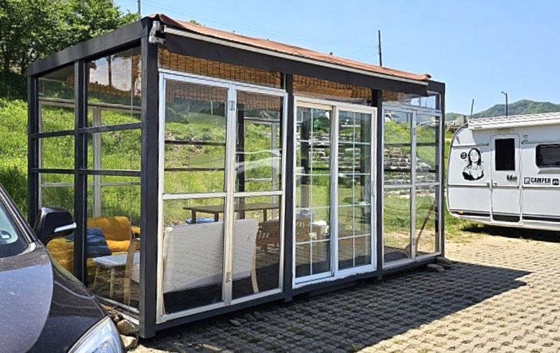 안팎이 훤히 보이는 투명한 벽체로 마감한 철제 건축물 안에는 의자와 테이블, 화로대 등 캠핑 용품이 갖춰져 있었다.