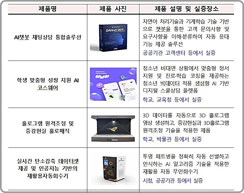 선정 제품들은 자동응대 AI챗봇 채팅상담 통합솔루션, 청소년 맞춤형 정서 지원 및 진로·학습 코칭을 제공하는 AI 기반 디지털 학교상담 플랫폼, 3D 홀로그램 원격조정 제품 등 미래 첨단기술이다.