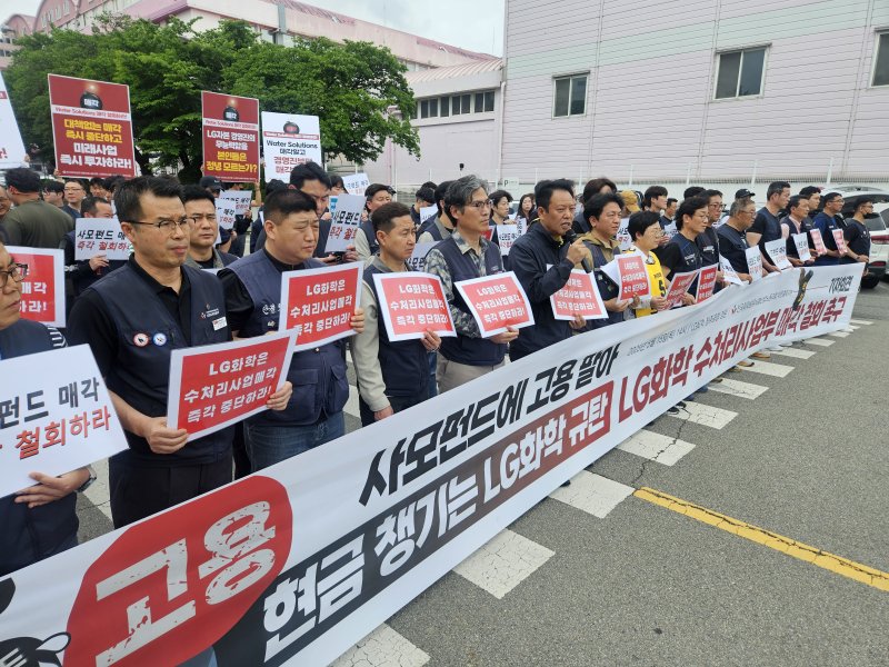 LG화학 워터솔루션 매각 소식에 화섬식품노조 대전충북지부와 근로자는 지난 15일 기자회견을 열어 G화학 워터솔루션즈(수처리사업부) 매각 철회와 고용 보장을 요구했다.
