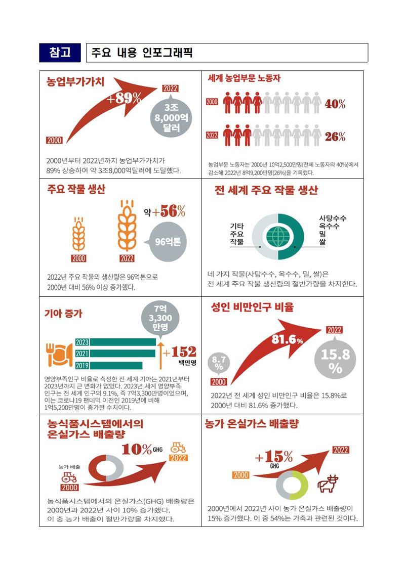 2022년 전 세계 성인 비만율은 15.8%로, 2000년 대비 81.6% 급증했다. 같은 해 농식품시스템에서 발생한 온실가스 배출량은 162억t CO2 상당치(CO2eq)로, 2000년 대비 10% 증가했다. 특히 농가의 온실가스 배출량은 15% 증가했고, 그중 54%는 축산 부문에서 발생했다.
