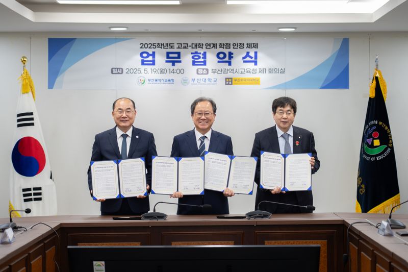 [파이낸셜뉴스] 부산시교육청은 지난 19일 시교육청에서 부산대학교, 부산외국어대학교와 ‘2025학년도 고교·대학 연계 학점 인정 체제 업무 협약’을 체결했다고 20일 밝혔다.
