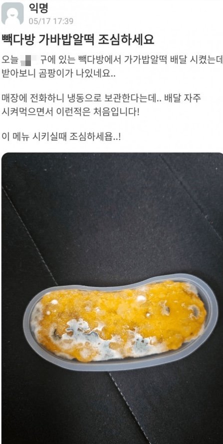 작성자 A씨는 "오늘 서울 XX구에 있는 빽다방에서 가바밥알떡 배달시켰는데, 받아보니 곰팡이가 나 있다"고 적었다.