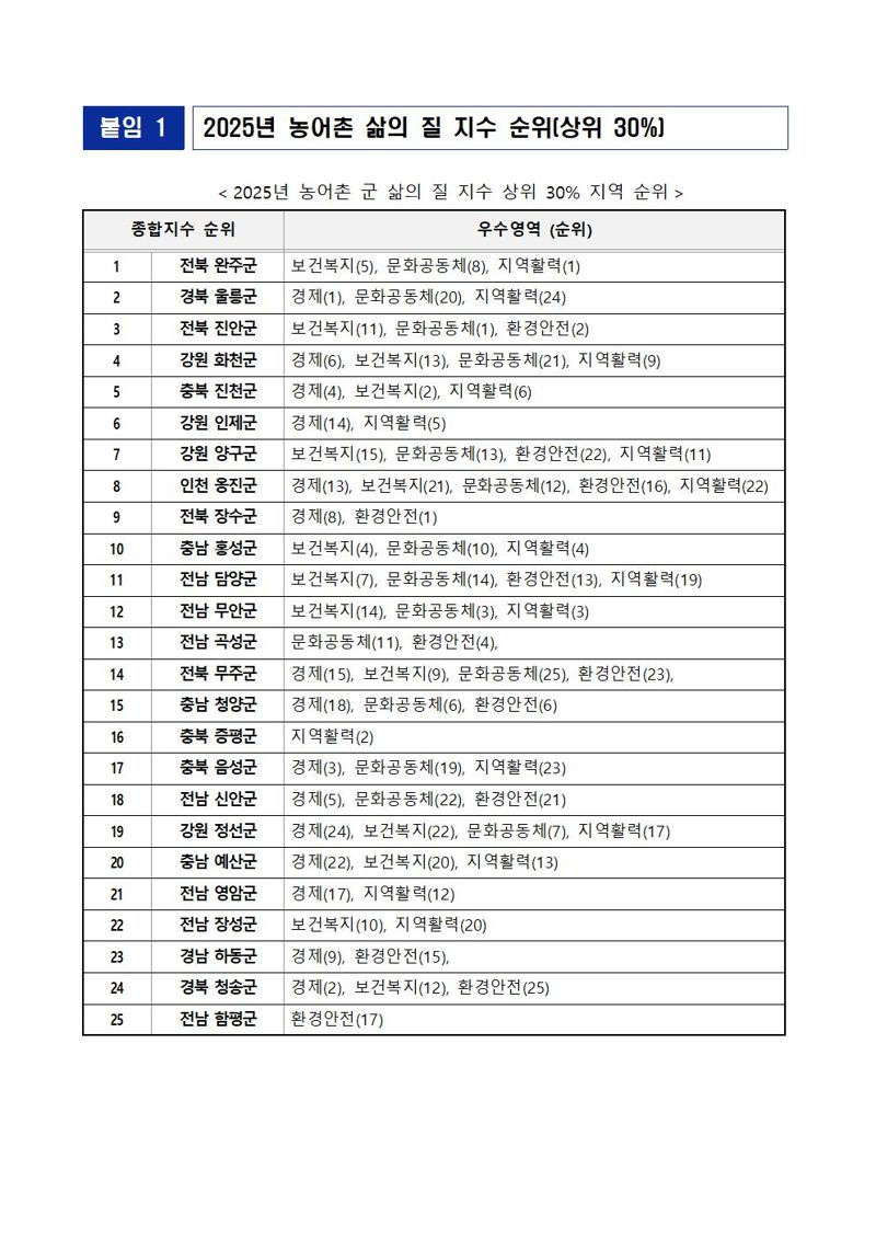 지역별로는 △전북 완주군(49.65점), △경북 울릉군(47.14점), △전북 진안군(46.67점)이 농어촌 군 지역 상위권에 올랐다. 도농복합시에서는 △경기 이천시(55.77점), △충남 아산시(55.27점), △경기 김포시(54.32점)가 종합지수 기준 상위지역으로 나타났다.