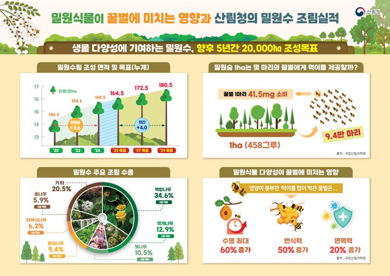 지난해까지 3000㏊였던 밀원수림 조성 면적 목표는 올해부터 4000㏊로 30% 확대했다. 2029년까지 2만㏊를 조성할 방침이다. 쉬나무, 피나무, 송악 등 새로운 밀원수림을 조성한다. 꿀벌 생태계 보호와 지속가능한 양봉기반 마련을 위한 다양한 밀원수 신규 발굴 등 밀원 자원 연구를 강화할 계획이다.