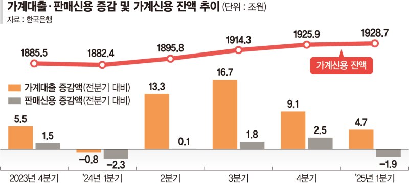 가계신용은 금융권 전체 가계대출에 결제 전 카드대금 등 판매신용을 합한 지표로, 가계가 부담하는 포괄적 빚을 의미한다. 제일 비중이 큰 가계대출은 1·4분기 1810조3000억원으로 전분기보다 4조7000억원 확대됐다. 증가 폭은 축소됐으나 1년 전에 비하면 43조9000억원 늘어난 수치다.