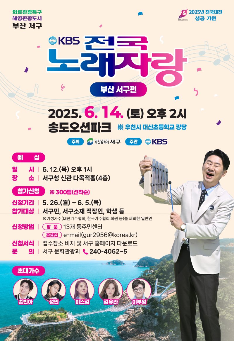 참가 대상은 기성 가수를 제외한 서구민, 서구 소재 직장인과 학생 등이며 선착순 300팀까지 모집한다.