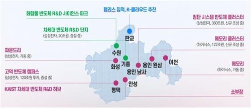 정부는 이들 시설과 기존 용인의 삼성전자 메모리 생산시설, 판교의 팹리스, 수원의 R&D파크, 화성의 삼성전자 파운드리, 평택의 시스템 반도체 생산시설 및 파운드리, 이천의 하이닉스 메모리 반도체 시설, 안성의 소부장(소재·부품·장비) 기업 등과 연계한 세계 최대·최고 클러스터를 구축한다는 방침이다.