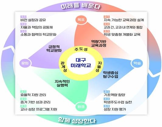 이를 위해 대구교육청은 대구미래학교 교육과정 실행력 강화를 위해 학기초 학급세우기 프로젝트와 학기별 2회 탐구프로젝트를 운영하고 10대 필수학습기능을 익힐 수 있도록 대구미래학교 학생용 워크북 '나는 탐구의 주인공, 초등 배움싹'을 개발·보급해 학생 기초역량 함양과 개념기반 탐구수업의 내실화하고 학생 성장 지원 평가를 강화한다.