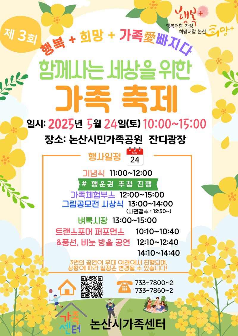 행사장인 시민공원 일원에서는 △비즈 팔찌 만들기 △가족사랑 엽서함 △전자 명함 키트 만들기 △세계 전통놀이 체험 등 가족 체험 부스는 물론, 먹거리 부스와 가족 벼룩시장도 펼쳐진다. 그림 공모전 시상식도 함께 열린다.