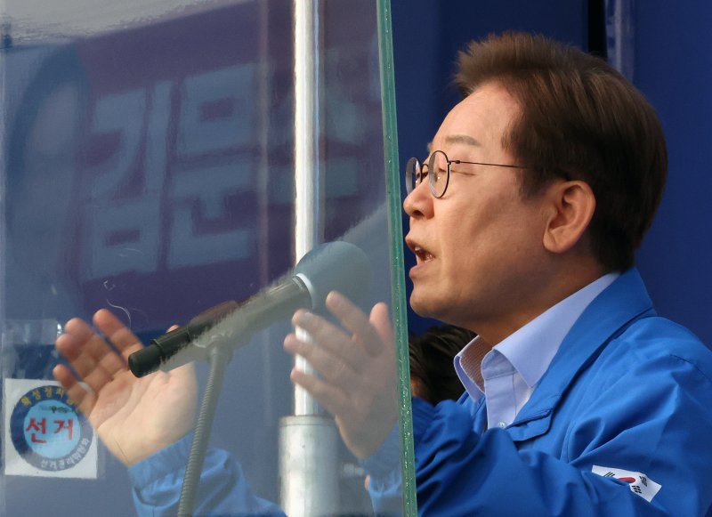 [서울·계양=뉴시스]신재현 김경록 기자 = 이재명 더불어민주당 대선 후보가 21일 자신의 지역구 인천시 계양구에서 국민의힘을 향해 "내란비호당은 미안하다고 말해야 한다", "김건희 여사에 대해 왜 말하지 못하나"라며 날을 세웠다.