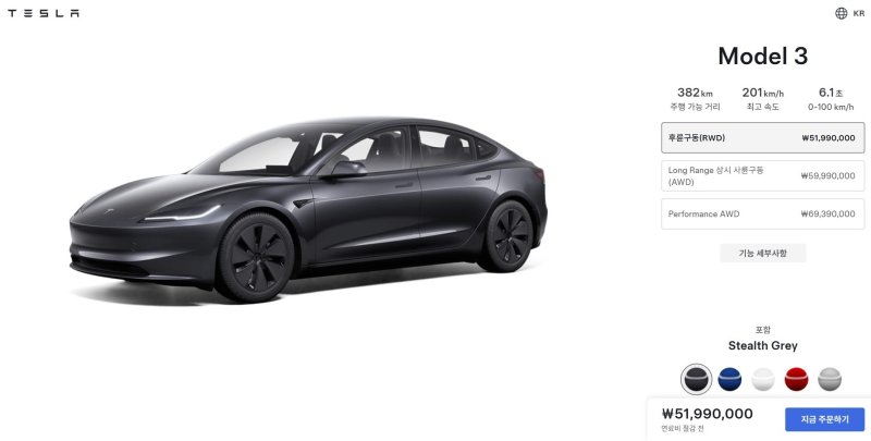 반면 같은 날 기준 테슬라코리아 홈페이지에선 모델3 RWD가 5199만원, 롱레인지 모델이 5999만원, 퍼포먼스 모델은 6939만원에 판매되고 있다. 정부 보조금을 감안해도 일본보다 700만~800만원 더 비싸다.