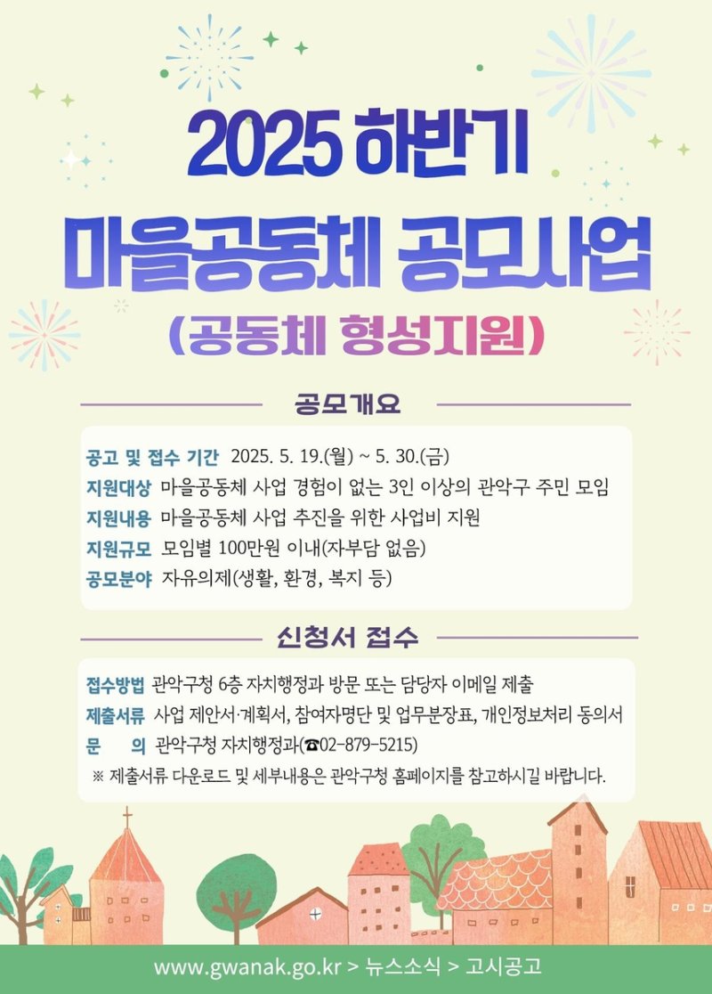 (서울=연합뉴스) 정준영 기자 = 서울 관악구(구청장 박준희)는 오는 30일까지 '2025년 하반기 마을공동체 공모사업' 참여자를 모집한다고 23일 밝혔다.