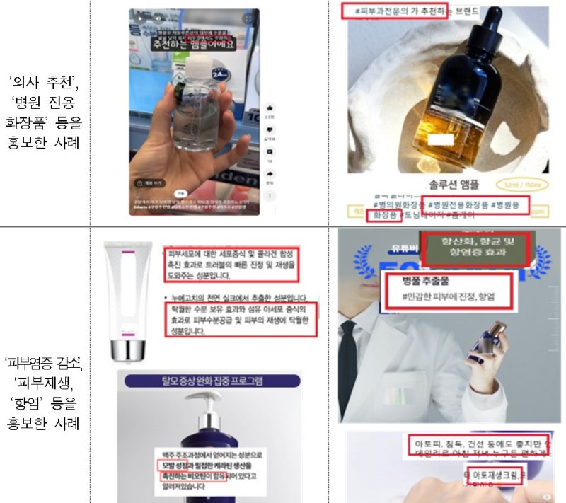 식약처는 ▲'00의사 추천', '병원전용', '병원추천' 등 사실과 다르게 소비자를 속이거나 소비자가 잘못 인식할 우려가 있는 광고(91건, 38.4%) ▲'피부염증감소', '피부재생', '항염' 등 의약품 효능·효과를 표방해 화장품을 의약품으로 잘못 인식할 우려가 있는 광고(114건, 48.1%) ▲'주름개선' 등 일반화장품을 기능성화장품으로 오인하거나 기능성화장품 심사 내용과 다른 광고(32건, 13.5%) 등을 적발했다.