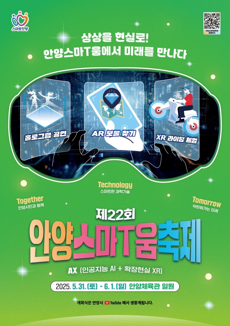 ‘상상을 현실로! 안양스마T움에서 미래를 만나다’를 슬로건으로 최신 정보과학기술의 체험 기회 등을 제공한다. 이와 함께 인공지능(AI)과 확장현실(XR)을 결합한 ‘인공지능 대전환(AX)’으로, 확장현실(XR) 기술이 적용된다.
