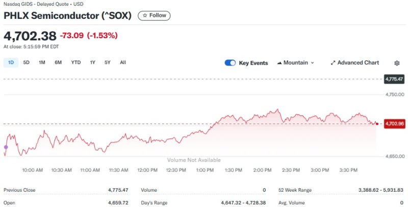 23일(현지시간) 뉴욕증시에서 반도체지수는 1.53% 하락한 4702.38포인트를 기록했다.