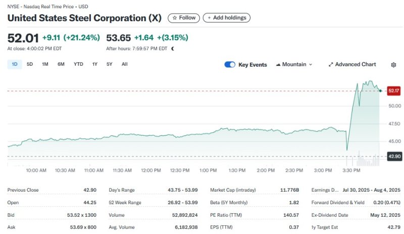23일(현지시간) 뉴욕증시에서 US스틸은 21.24% 폭등한 52.01달러를 기록했다.