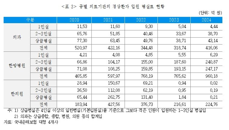 자동차보험 점유율이 높은 4개 대형 손해보험사를 통해 집계된 한방병원의 경상환자의 상급병실 입원 병실료도 2022년 159억8500만원에서 2024년 247억1700만원으로 꾸준히 증가했다.