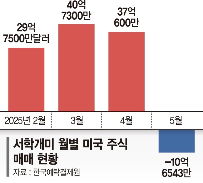 25일 한국예탁결제원에 따르면 국내 투자자는 5월 1~23일 국내 투자자는 미국 시장에서 총 10억6543만달러(약 1조4584억원)를 순매도했다. 서학개미는 지난해 10월부터 올해 4월까지 7개월 동안 순매수를 이어왔다. 트럼프 대통령의 관세 정책 등으로 미 증시가 급락했던 올해 2월과 3월에도 각각 29억7500만달러(4조758억원), 40억7300만달러(5조772억원)를 순매수하며 미 증시에 대한 신뢰를 보여왔다.