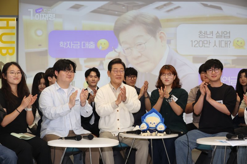 이재명 더불어민주당 대통령 후보가 26일 경기 수원시 아주대학교에서 열린 '아주대와 함께하는 아주 특별한 대학생 간담회'에 참석해 손뼉치고 있다. (공동취재) 2025.5.26/뉴스1 ⓒ News1 안은나 기자