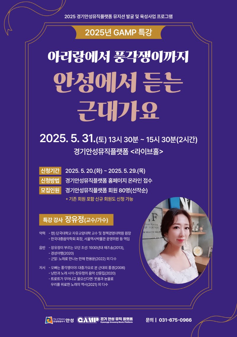 [안성=뉴시스] 정숭환 기자 = 경기안성뮤직플랫폼은 31일 2025년 특강 '아리랑에서 풍각쟁이까지–안성에서 듣는 근대가요'를 진행한다.