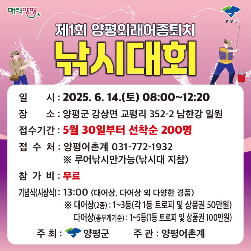 외래어종 퇴치를 위해 열리는 이번 낚시대회는 지역주민은 물론 외지인도 무료로 참여할 수 있는 개방형 행사로, 양평군 강상면 교평리 352-2번지 일원에서 진행된다.