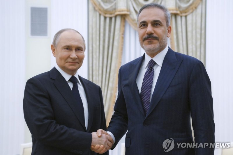 (모스크바=연합뉴스) 최인영 특파원 = 블라디미르 푸틴 러시아 대통령이 26일(현지시간) 하칸 피단 튀르키예 외무장관과 우크라이나 상황을 논의했다.