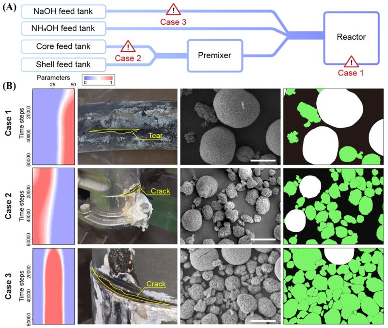 연구팀은 이 같은 니켈 용출을 억제할 수 있도록 공정 조건을 최적화하고, AI 기반 실시간 설비 이상 감지 기술을 함께 개발했다. 금속 이온이 녹아 있는 원료 용액을 휘젓는 속도, 산성도(pH), 암모니아 농도 등을 조절해 니켈은 입자 안쪽에, 코발트와 망간은 바깥쪽에 배치되도록 설계한 것이다. 니켈이 입자 내부에 자리 잡으면 용출 가능성이 낮아지고 구조적 안정성도 높아진다.