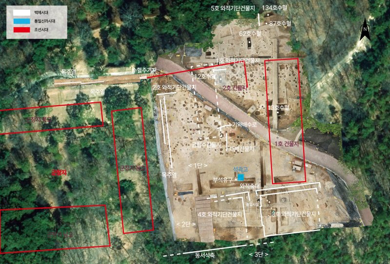 첫 단에서는 백제시대 굴립주 건물지와 와적기단 건물지, 저장시설, 통일신라부터 조선시대에 이르는 건물지도 확인됐다.