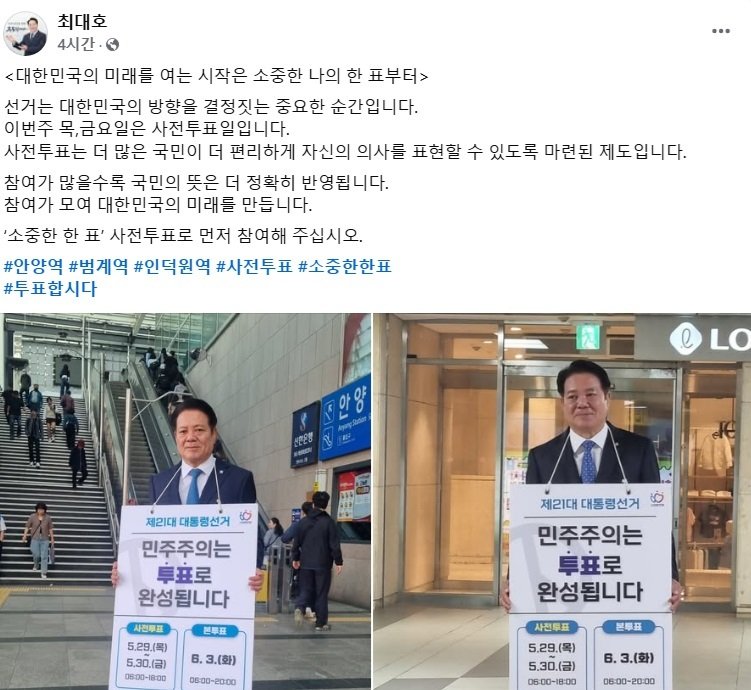 최 시장은 27일 오전 자신의 사회관계망서비스(SNS)에 올린 글을 통해 "선거는 대한민국의 방향을 결정짓는 중요한 순간이다. 이번 주 목·금요일은 사전투표일"이라고 전했다.