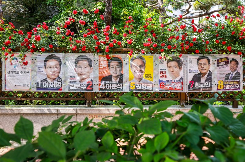 [서울=뉴시스] 정병혁 기자 = 제21대 대통령 선거를 일주일 앞둔 27일 서울 용산구 효창동에 위치한 한 아파트 화단에 심어진 장미꽃 밑으로 벽보가 걸려있다. 2025.05.27. jhope@newsis.com [서울=뉴시스] 류현주 기자 = 제21대 대통령선거가 일주일 앞으로 다가왔다.
