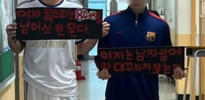 27일 안양여성연대에 따르면 지난 16일 A 고교 체육대회가 열린 가운데 남학생 2명이 "여자 목소리는 80㏈을 넘으면 안 된다" "여자는 남자 말에 말대꾸하지 않는다"는 문구가 적힌 피켓을 든 사진이 SNS 등 인터넷에 공유됐다.