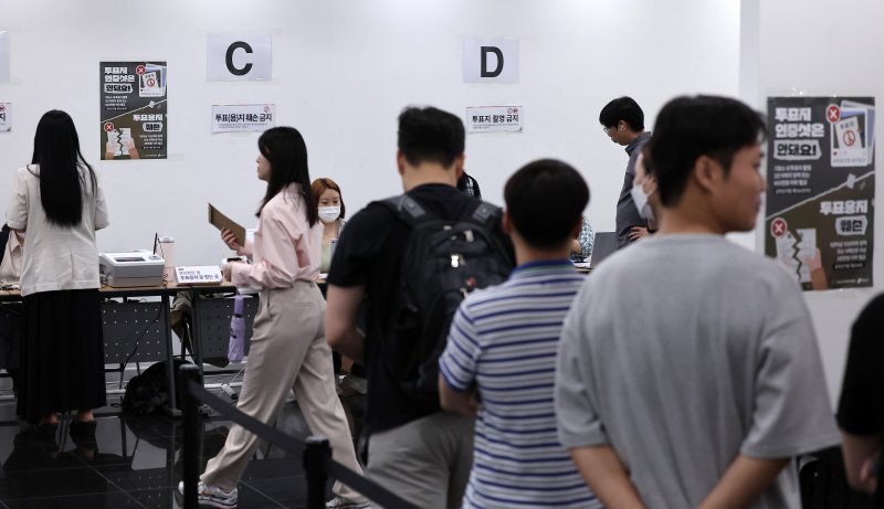역삼1동 앞에서 사전투표자 수를 집계하던 유튜버는 "본투표 하라니까 말을 안 듣는다"며 "줄이 지금 꺾이고 꺾여서 관외 (투표자는) 사람이 엄청 많다"고 전했다.