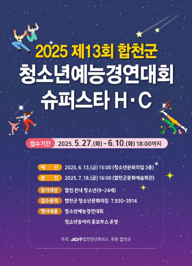 [합천=뉴시스] 서희원 기자 = 경남 합천군(군수 김윤철)은 관내 청소년을 대상으로 ‘제13회 청소년예능경연대회 슈퍼스타 H·C’ 참가자를 내달 10일 오후 6시까지 모집한다고 29일 밝혔다.