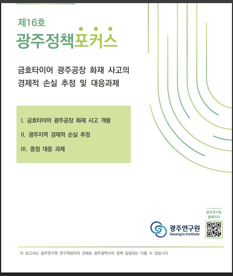 광주연구원은 29일 발간한 '광주정책포커스- 금호타이어 광주공장 화재 사고의 경제적 손실 추정 및 대응과제'를 통해 이번 화재 사고가 지역 경제에 미치는 부정적인 영향을 분석하며 이같이 밝혔다.