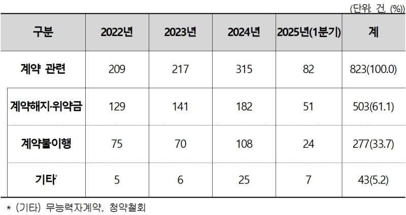 신청 이유로는 계약 관련 불만이 823건(56.3%)으로 절반가량을 차지했다.