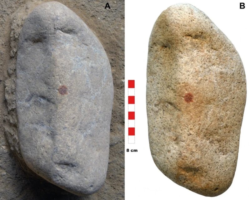 연구진은 네안데르탈인이 돌의 균열이나 독특한 형태에 주목해, 손가락에 붉은 안료를 묻혀 중앙의 코 위치에 찍음으로써 이목구비를 갖춘 얼굴을 의도적으로 형상화한 예술적 표현일 가능성이 있다고 설명했다.
