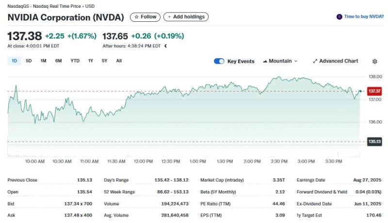2일(현지시간) 뉴욕증시에서 엔비디아는 1.67% 상승한 137.38달러를 기록했다. 이로써 시총도 3조3500달러로 늘었다.