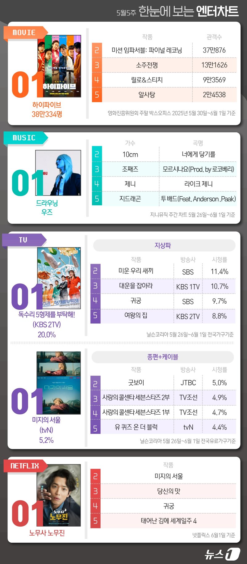 ◇ 지상파=KBS 2TV '독수리 5형제를 부탁해!' 1위(닐슨코리아 2025년 5월 26일~6월 1일 전국 가구 기준)