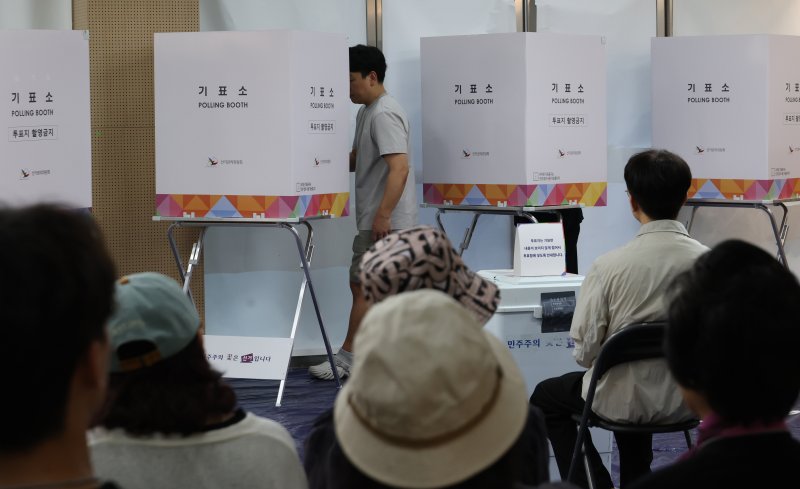 제21대 대통령선거일인 3일 서울 은평구 동명여고에 마련된 투표소에서 참관인들이 투표과정을 지켜보고 있다. 연합뉴스