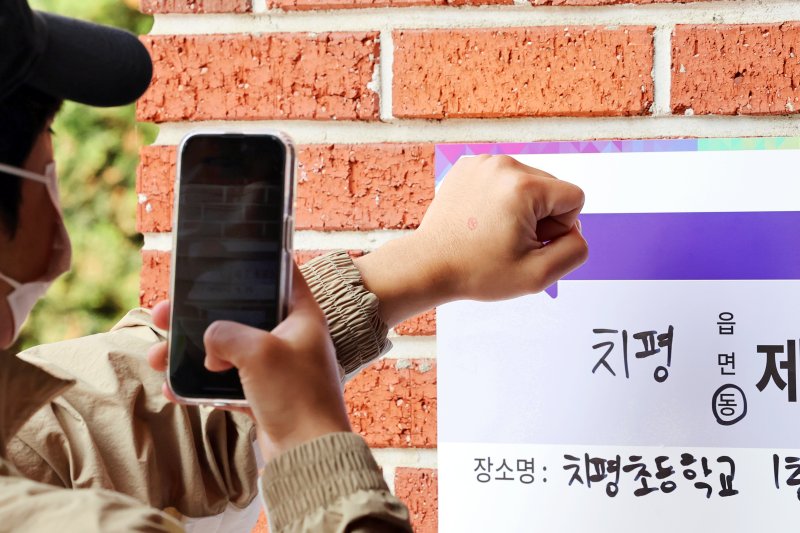제21대 대통령선거 투표일인 3일 오전 광주 서구 치평동 한 투표소에서 한 시민이 기념사진을 찍고 있다. 연합뉴스