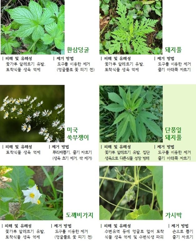 (원주=연합뉴스) 임보연 기자 = 환경부 원주지방환경청은 오는 9일 양구군과 합동으로 양구읍 학조리 일원에서 군부대, 지역 민간 단체가 참여한 가운데 단풍잎돼지풀 등 생태계 교란 식물 제거작업을 벌인다고 4일 밝혔다.