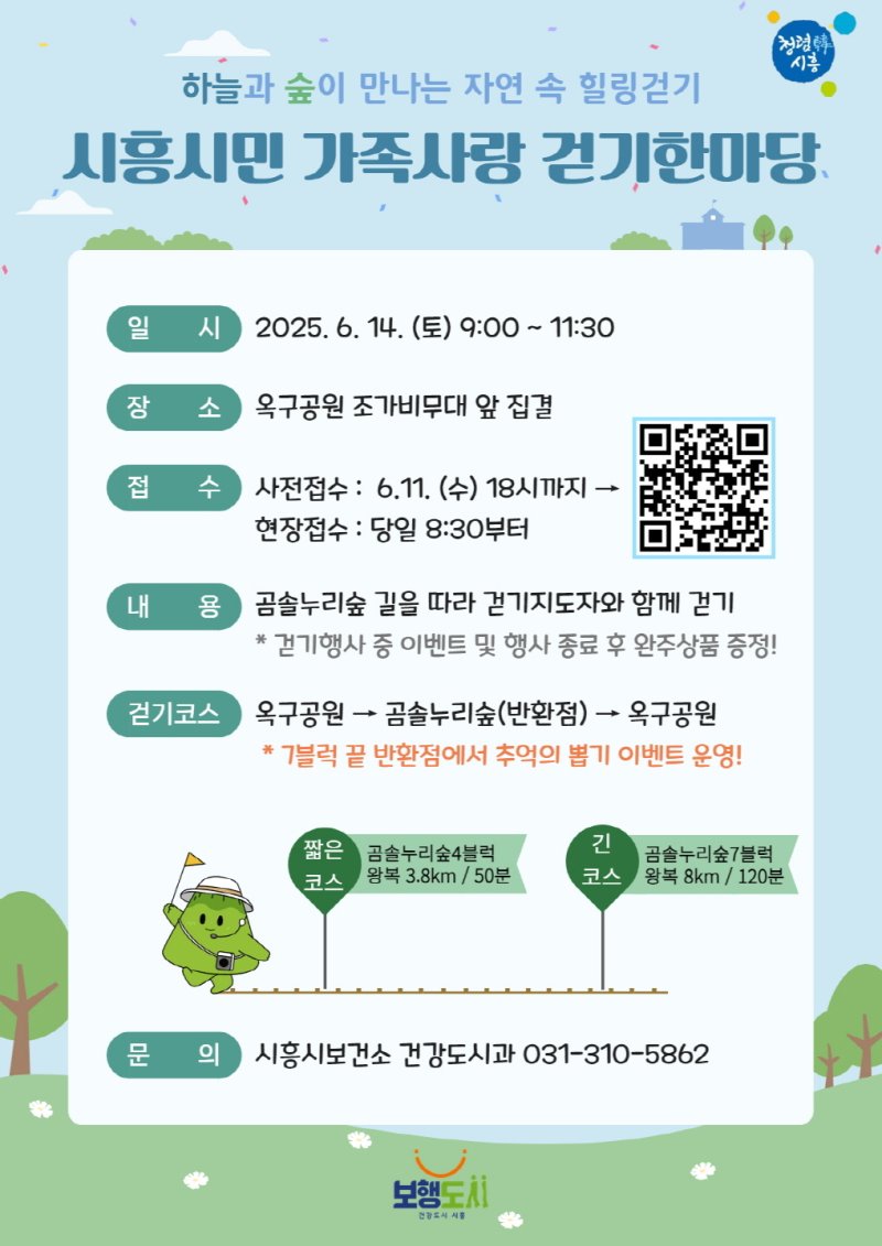 시에 따르면 이번 걷기한마당 코스는 옥구공원 조가비무대를 출발해 곰솔누리숲을 반환점으로 되돌아오는 왕복 2개 코스로 돼 있다. 짧은 코스는 왕복 3.8㎞(50분), 긴 코스는 왕복 8㎞(120분)다.